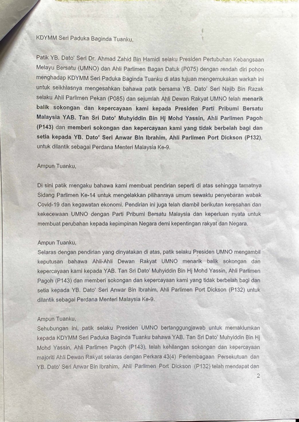 The letter has been circulating on social media and is addressed to the Yang di-Pertuan Agong. Umno - from king to kingmaker. Any minority government.